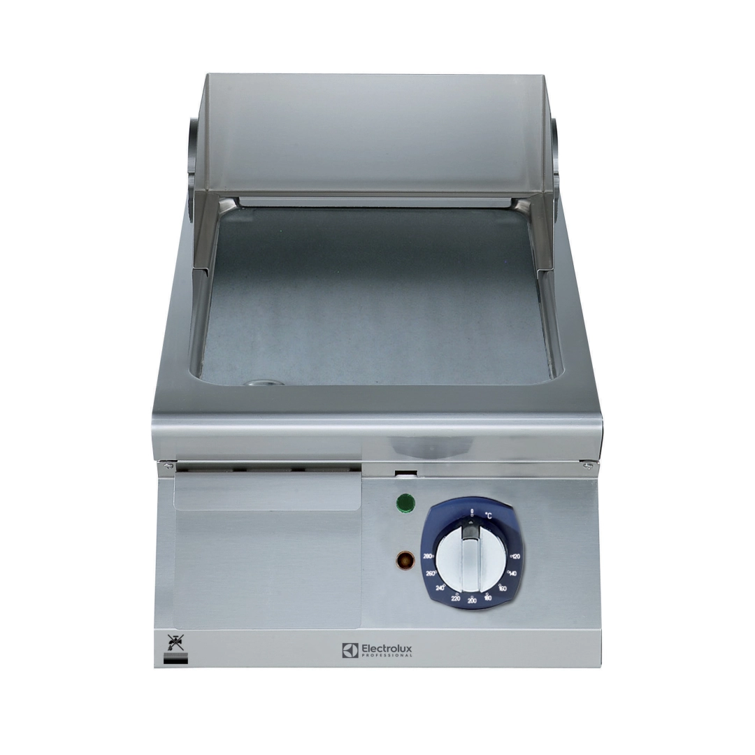 ELECTROLUX PROFESSIONAL je električni žar iz linije Modular Cooking Range 700XP, zasnovan za profesionalne kuhinje. Ta polmodularni električni žar ima gladko kuhalno površino iz brušenega kroma debeline 12 mm, ki zagotavlja optimalne rezultate pečenja in enostavno čiščenje. Naprava omogoča natančen nadzor temperature v razponu od 120 °C do 280 °C, kar omogoča prilagodljivost pri pripravi različnih jedi. Infrardeči grelni elementi so nameščeni pod kuhalno površino, kar zagotavlja enakomerno segrevanje. Vključeni so tudi strgalo za gladko ploščo in zamašek. Zunanje plošče so izdelane iz nerjavečega jekla s Scotch Brite obdelavo, kar zagotavlja trpežnost in profesionalen videz. Delovna površina je iz enega kosa stisnjenega nerjavečega jekla debeline 1,5 mm. Model ima pravokotne stranske robove, ki omogočajo tesno povezavo med enotami, s čimer se odpravijo vrzeli in morebitna mesta za nabiranje umazanije. Za varnost in higieno je opremljen z visokim zadnjim in stranskima zaščitnima robovoma ter varnostnim termostatom. Poleg tega ima zaščito pred vdorom vode IPX4.Naprava je primerna za namestitev na odprte osnovne omarice, mostovne podpore ali konzolne sisteme, kar omogoča prilagodljivost pri postavitvi v kuhinji.