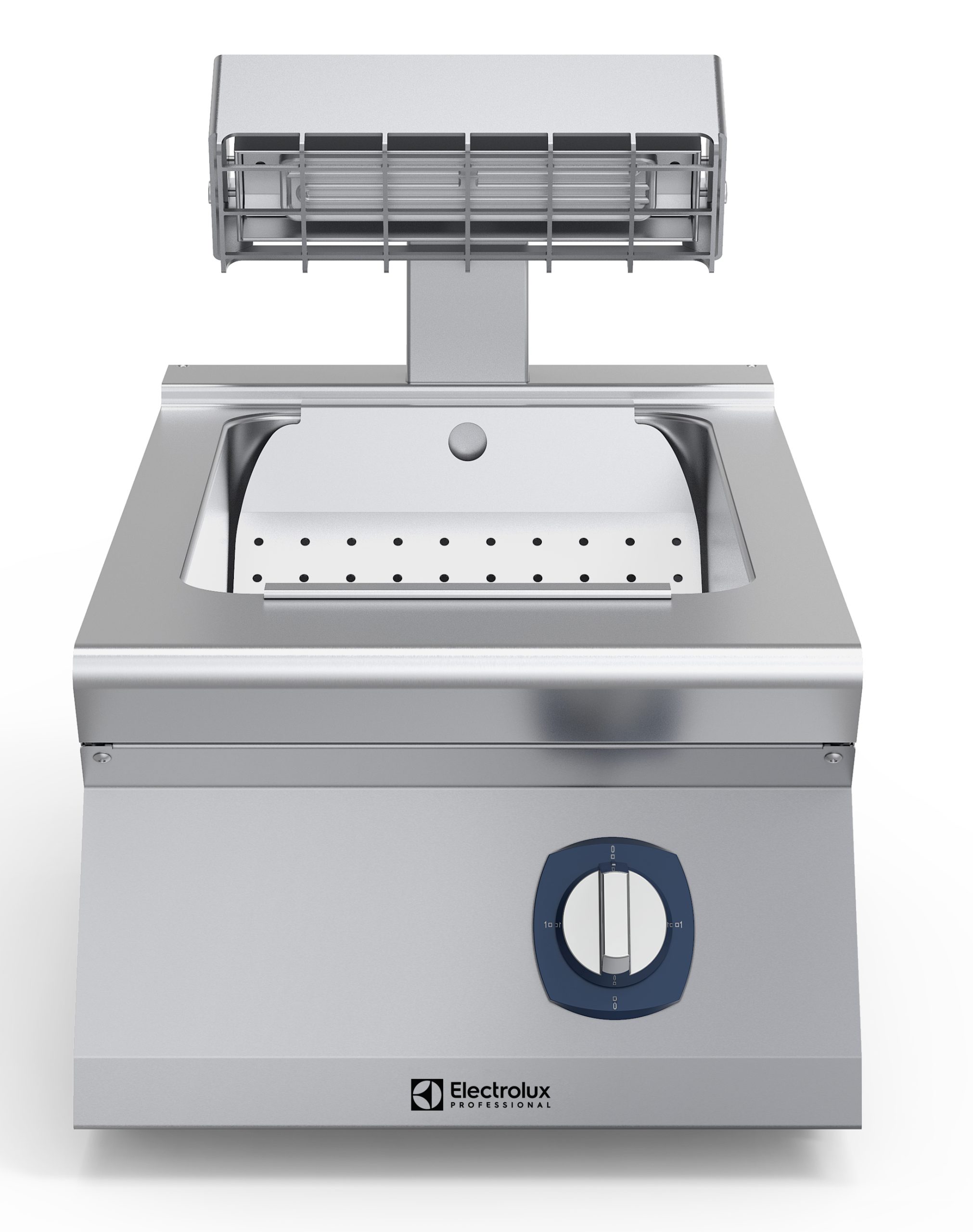 Electrolux Professional električni grelni modul za ocvrt krompir (chip scuttle) z infrardečimi grelnimi elementi, nameščenimi na zadnji strani naprave, ki ohranjajo ocvrto hrano toplo, dokler ni pripravljena za serviranje. Takšna zasnova omogoča, da hrana ostane hrustljava in na ustrezni temperaturi, brez izgube kakovosti.